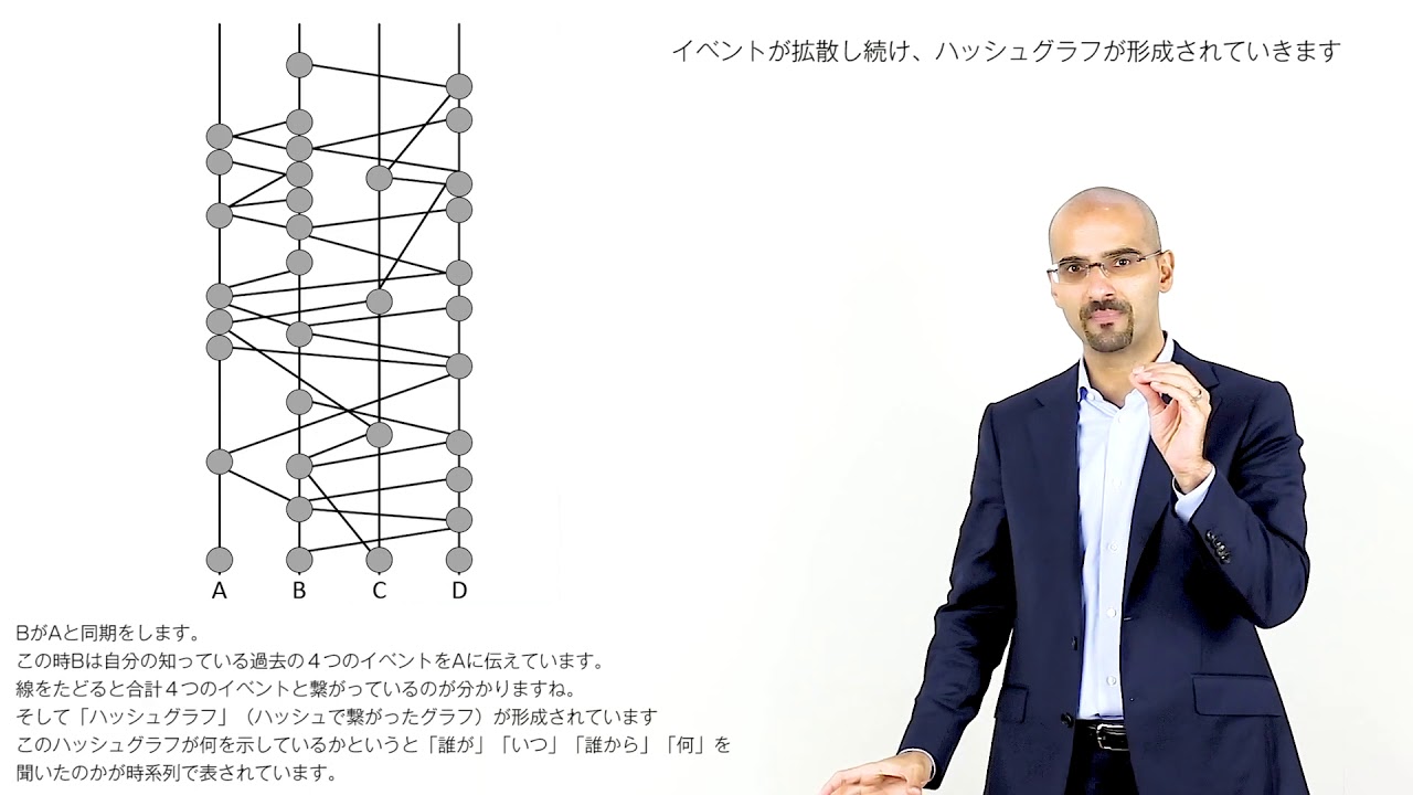 BがAと同期をします。この時Bは自分の知っている過去の4つのイベントをAに伝えています。線をたどると合計4つのイベントと繋がっているのが分かりますね。そして「ハッシュグラフ」(ハッシュで繋がったグラフ)が形成されています。このハッシュグラフが何を示しているかというと「誰が」、「いつ」、「誰から」、「何を」聞いたのかが時系列で表されています。